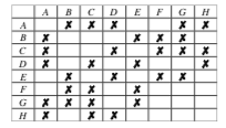 A, B, C, D, E, F, G et H désignent huit poissons ; dans le tableau ci- dessous, une croix signifie que les poissons ne peuvent cohabiter dans un même aquarium :